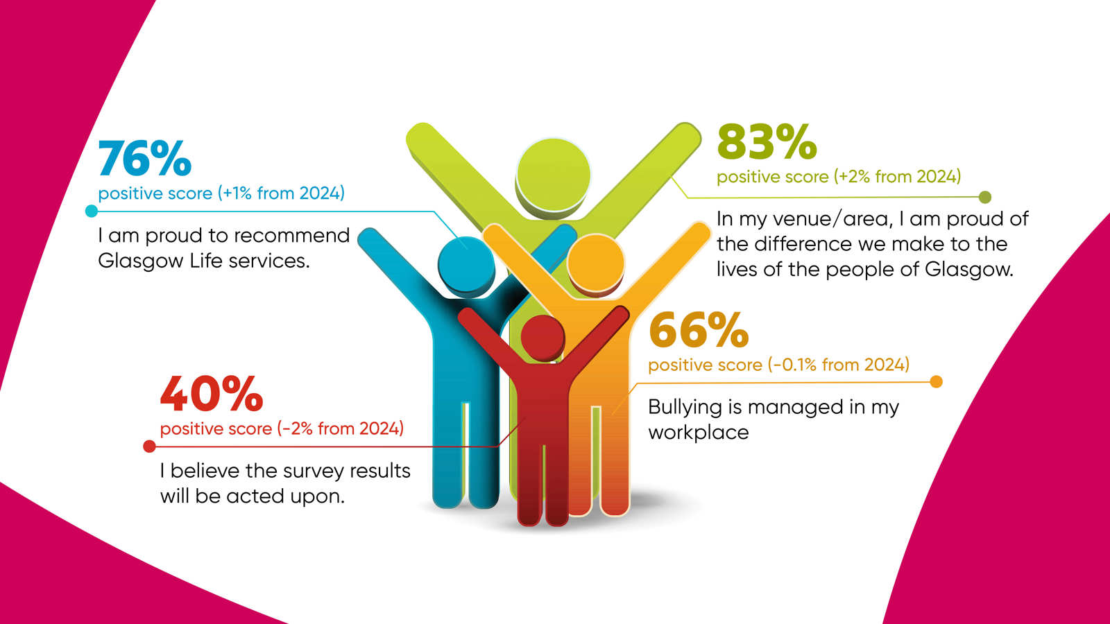 We will continue to take action to improve our scores and make Glasgow Life a great place to work. The Heads of Service now have the results, and they will meet with their teams to review these and create their commitments for 2026. We will share these plans with you early next year. Throughout 2026, we will continue to highlight actions from each service and explore new ways to share them.
