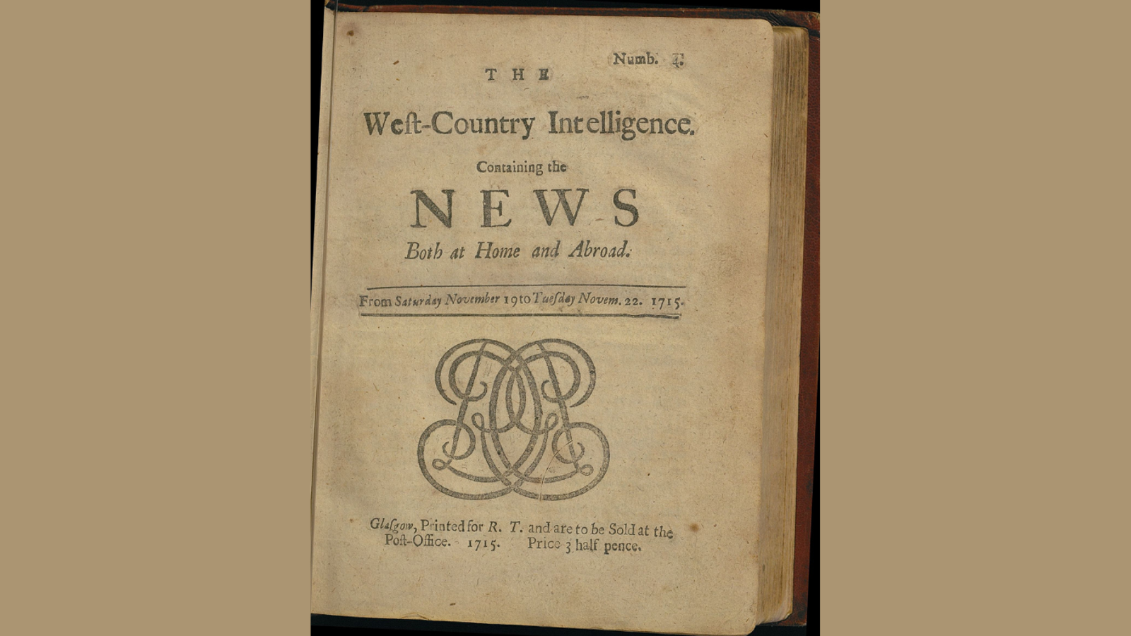 The title page of the Courant is set out like a contemporary book title page, with no headlines or columns of text. We can see the imprint at the bottom of the page that states where the newspaper could be bought, namely at the ‘Printing House in the Colledge’ (referring to the printing press at the University of Glasgow) ‘and at the Post-Office’.[1] There is no stated name of a printer, however the ornate monogram of a D and G (that to the quick glance appears to be a fancy drawing) on each cover refers to the initials of Donald Govan, the named Printer to the University. The ‘R.T.’ mentioned in the imprint is the enterprising Robert Thompson, then Post Master of the Glasgow Post Office.