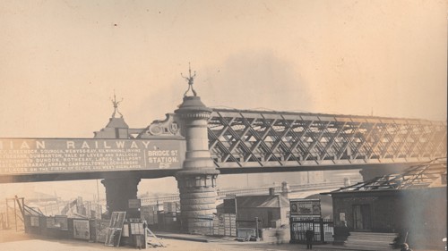 One of Arrol’s first big assignments came in 1876: the Caledonian Railway viaduct over the River Clyde that ran into the new Central Station. Only the piers now remain, standing next to the second bridge which was also built by Arrol in the first years of the 20th century.