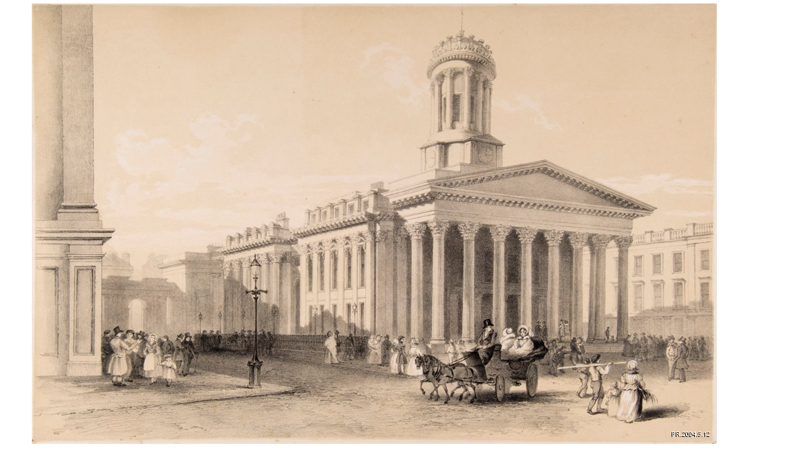 Stirling then sold the house to the Royal Bank of Scotland, which added a double staircase entrance to the first floor and converted the drawing room into the tellers’ room. It was the bank’s branch in Glasgow and signified the change in function of the site of the property from residential to commercial. The branch closed in 1827 when the Royal Bank of Scotland sold the building to subscribers to Glasgow’s Royal Exchange.